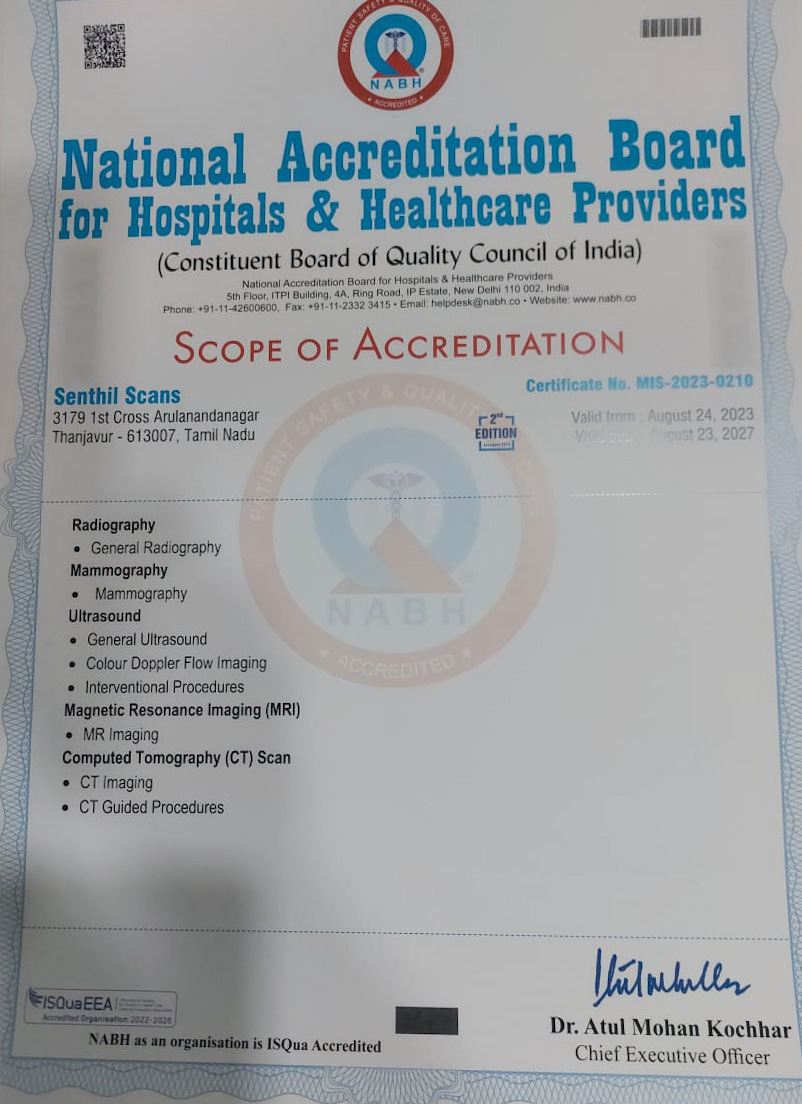 Senthil Scans, the popular Radiodiagnostic centre in Thanjavur started in 2012, is now a full-fledged, advanced centre. The centre is equipped with all state of art machines for a diagnostic centre including Ultrasound, CT scan, MRI scan, Mammogram, XRay, Laboratory, etc.,